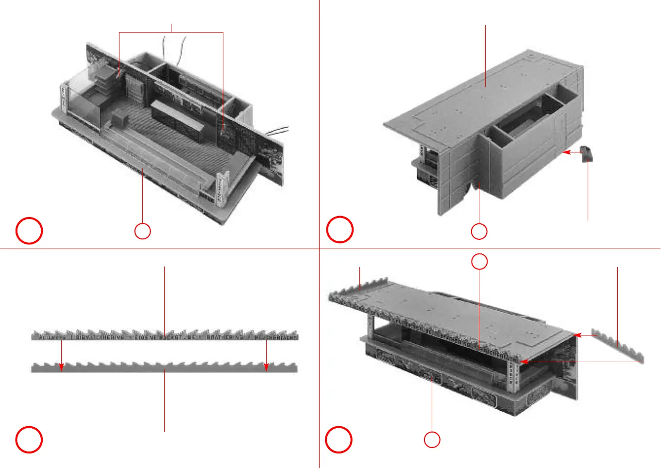 Faller 140445 - Assembly Step f: Electrical Component Integration; Assembly Step g: Main Body Assembly; Assembly Step h: Decorative Trim; Assembly Step i: Upper Structure Assembly
