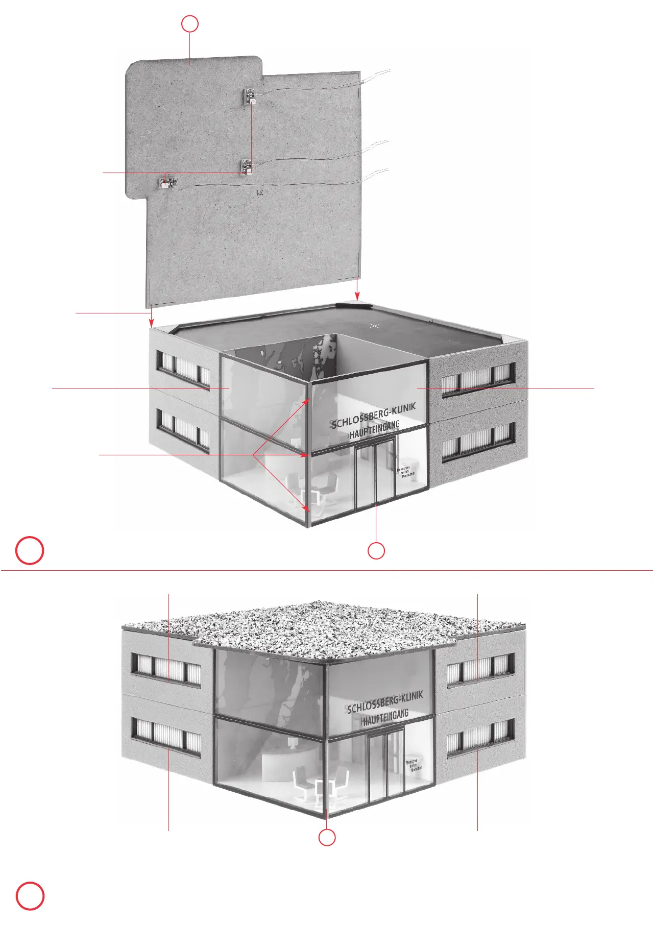 Die Spritzlinge mit den Restteilen zu den losen Spritzlingen mit den Teilen für das Hauptgebäude in die Hauptverpackung legen.
