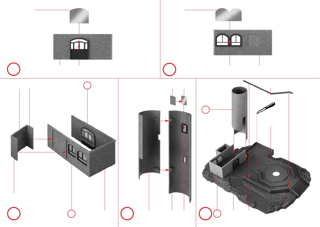Faller Schlossberg Inn - Main Structure Assembly - Base and Tower; Assembly Steps A-E
