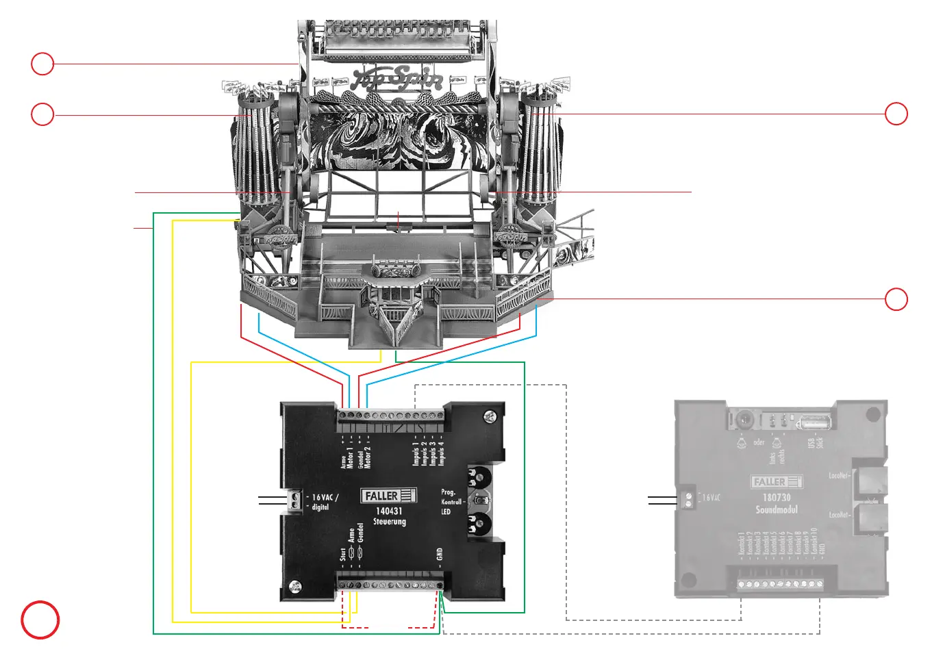 Faller TOP SPIN - Electronic Control and Wiring Diagram; Control Unit and Sound Module Connections; Motor and Reed Connections