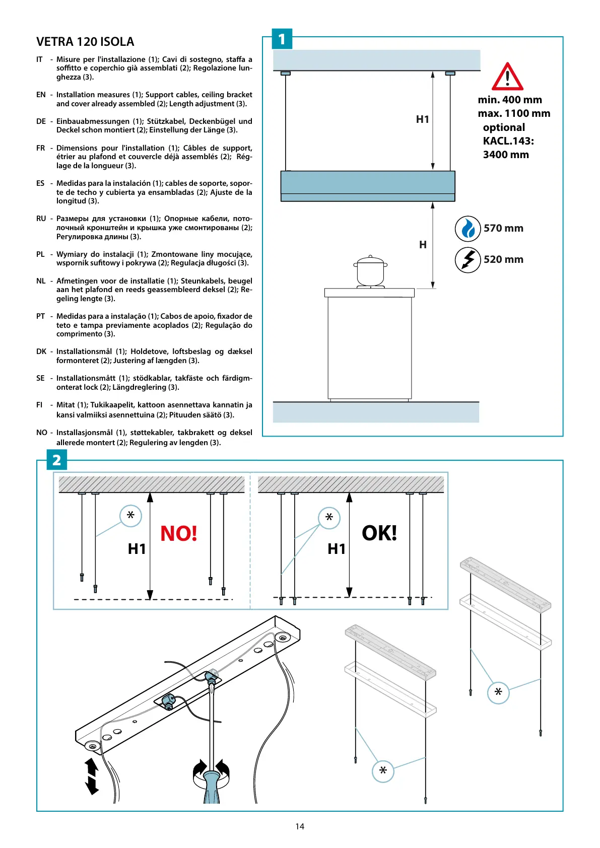 DE - Einbauabmessungen (1); Stützkabel, Deckenbügel und