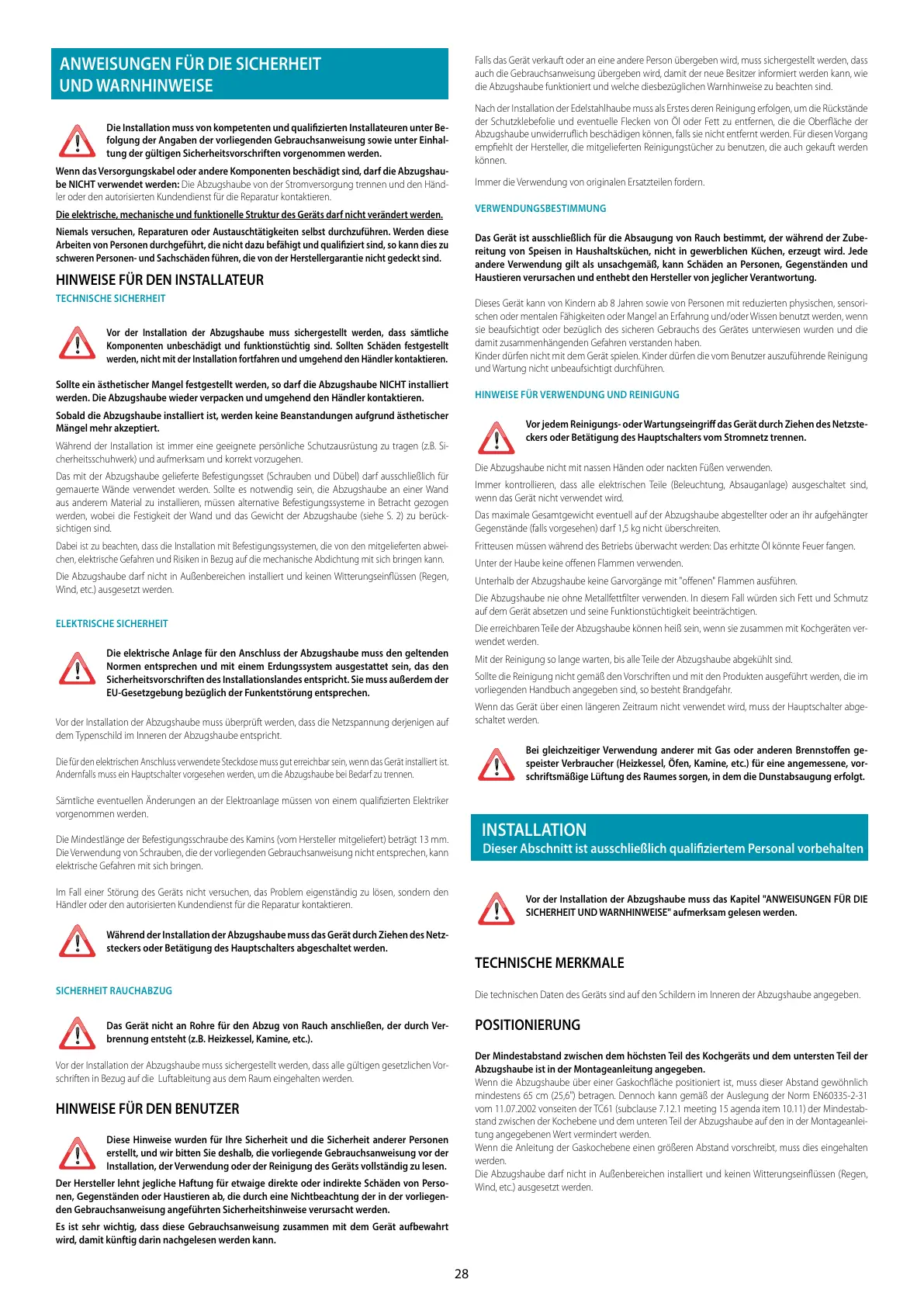 die Abzugshaube funktioniert und welche diesbezüglichen Warnhinweise zu beachten sind.