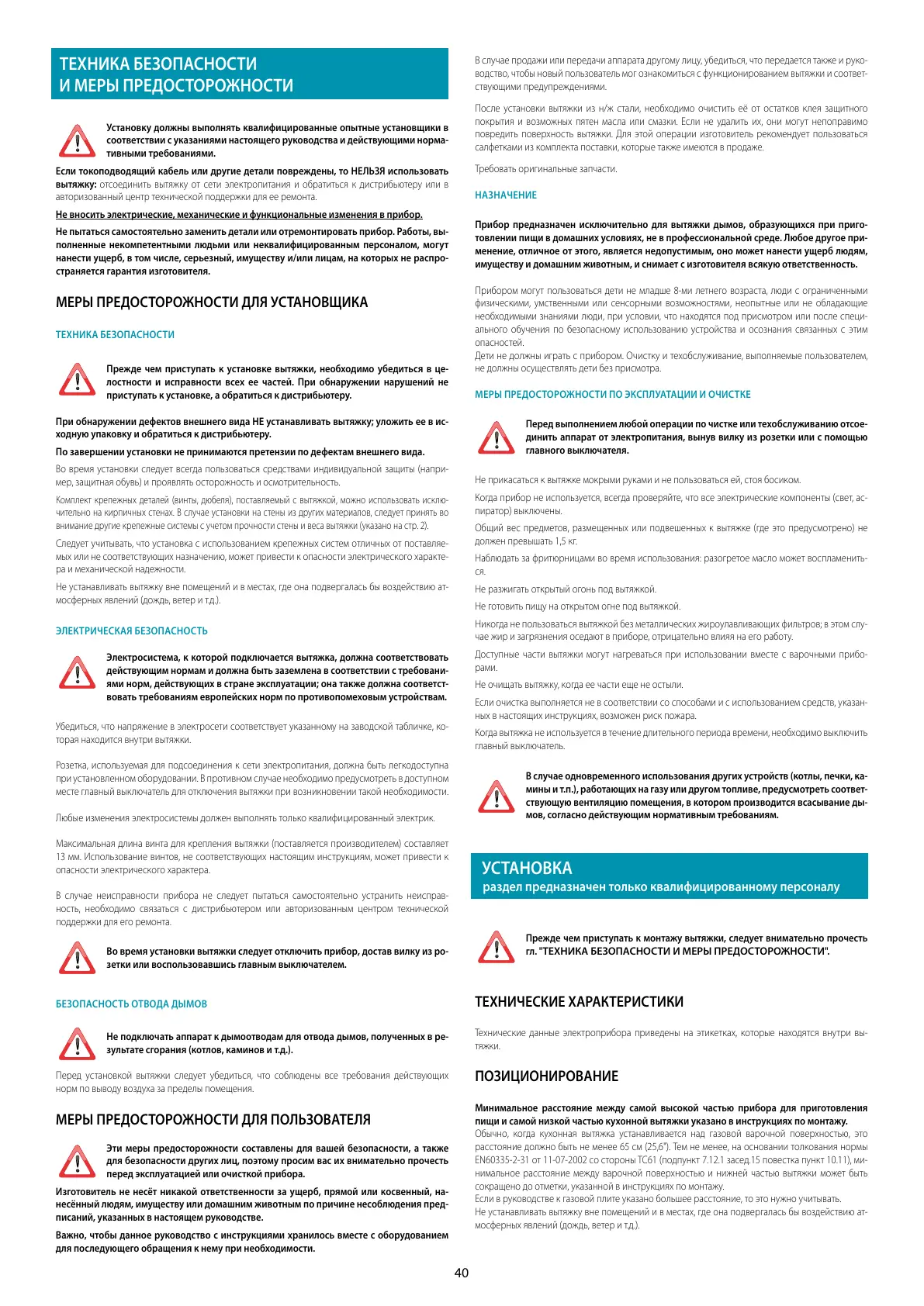 Перед установкой вытяжки следует убедиться, что соблюдены все требования действующих
