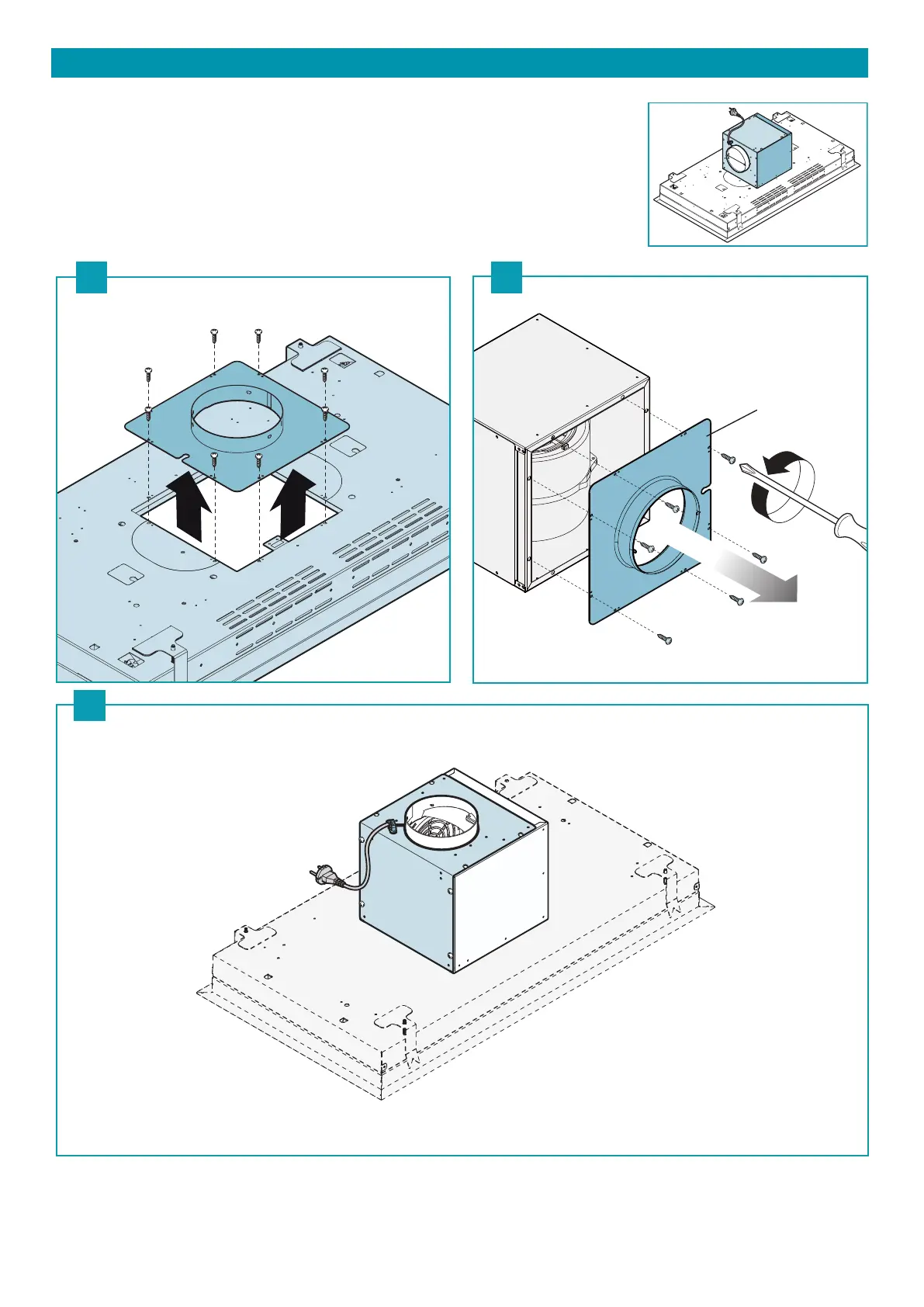 Remove the flange from the hood (1) and the motor (2). If the air outlet is upward, see (3).