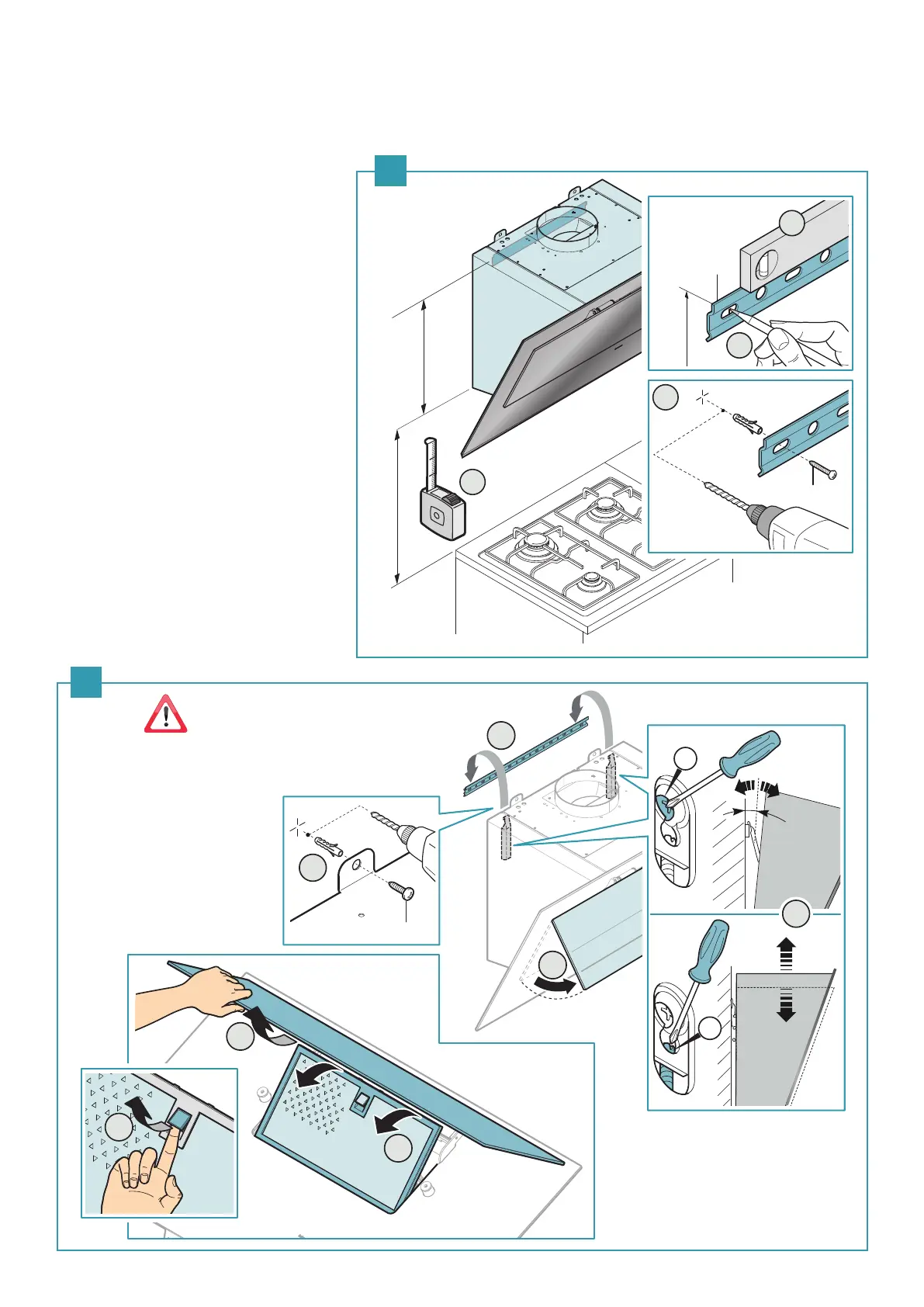 Misure per l’installazione (1). Fissaggio cappa (2).