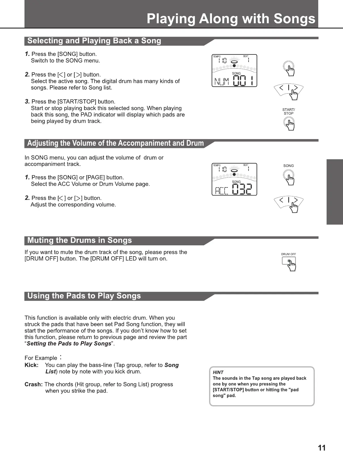 FAME DD 6500 - Playing Along with Songs; Song Selection and Playback Control; Utilizing Pads for Song Interaction