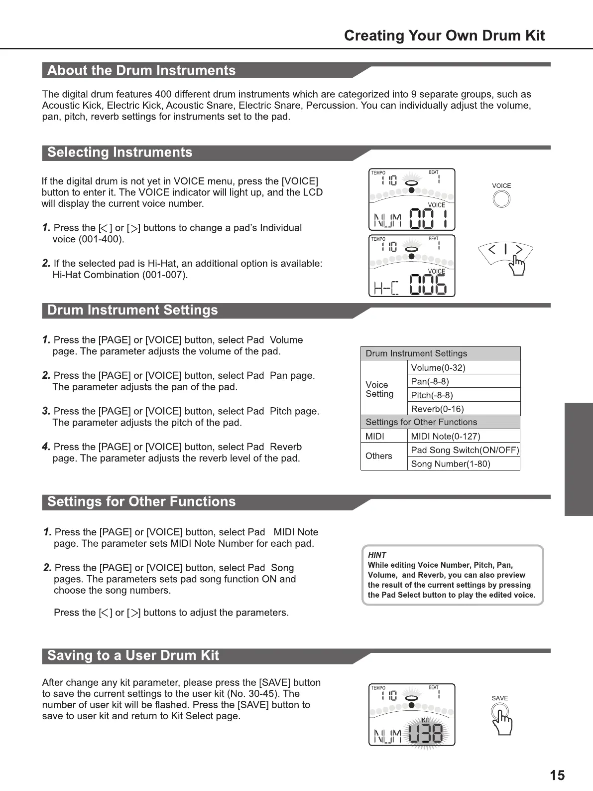 FAME DD 6500 - Drum Instrument Selection and Voice Editing; Other Pad Functions and Saving Custom Kits