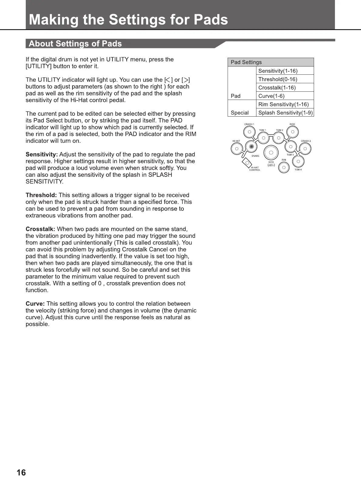 FAME DD 6500 - Making the Settings for Pads; Pad Sensitivity, Threshold, and Crosstalk; Pad Response Curves and Rim Sensitivity; Hi-Hat Splash Sensitivity and Saving Settings