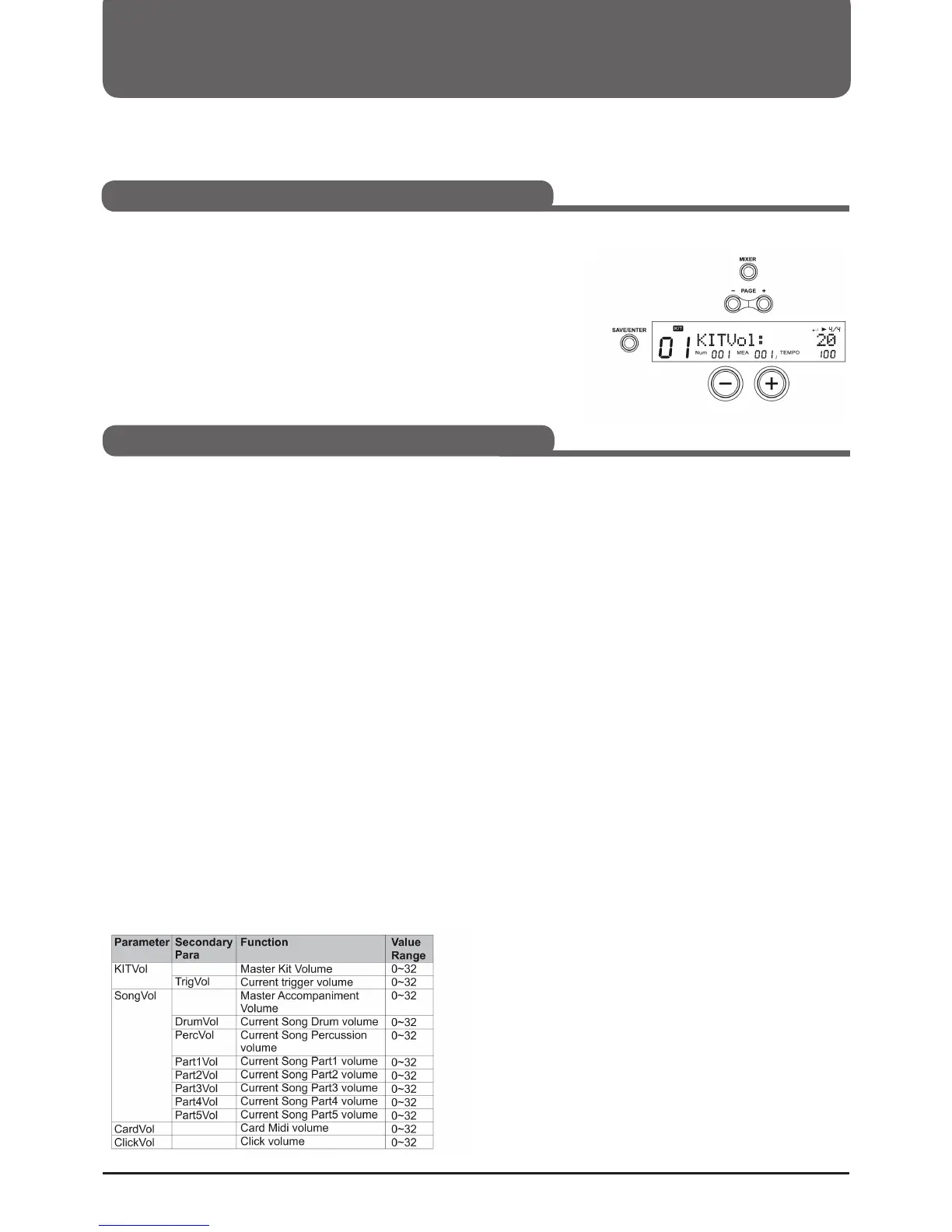 2. Press the PAGE +/- buttons to select "SongVol", "ClickVol"