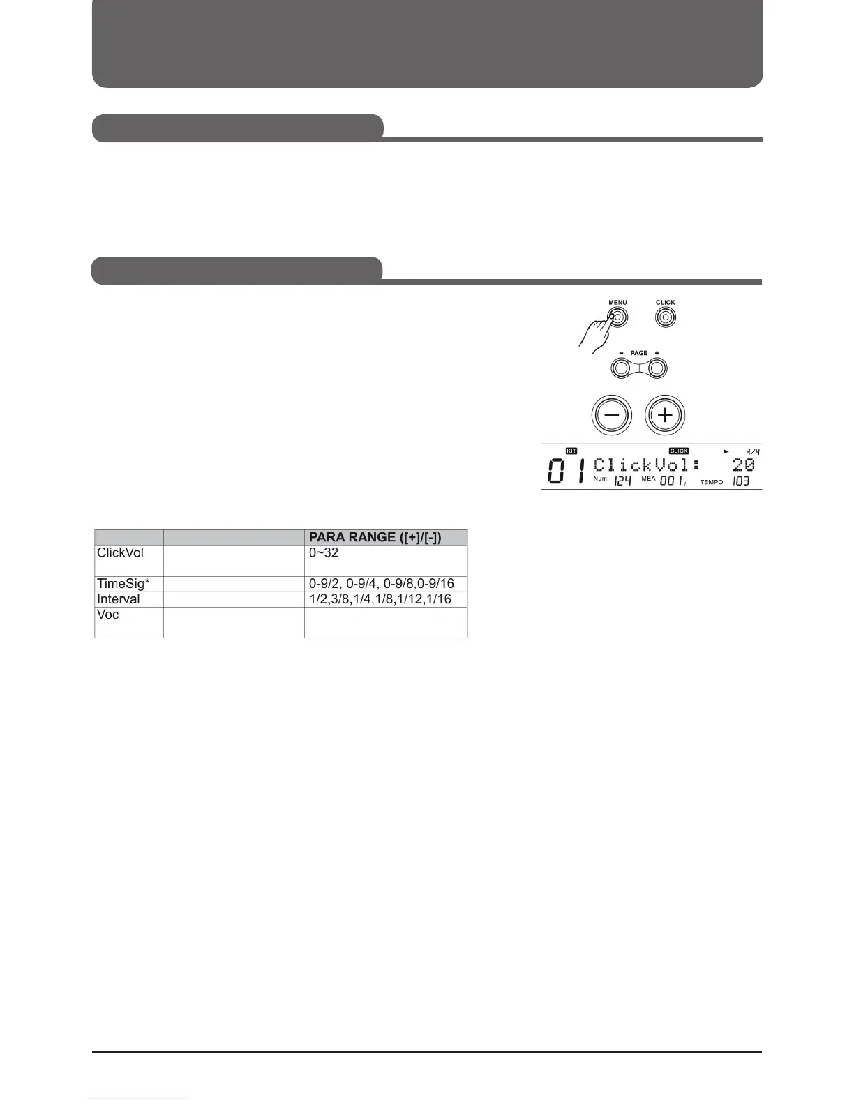 Auswahl der Click Stimme Voice/Metro/Claves/Sticks/