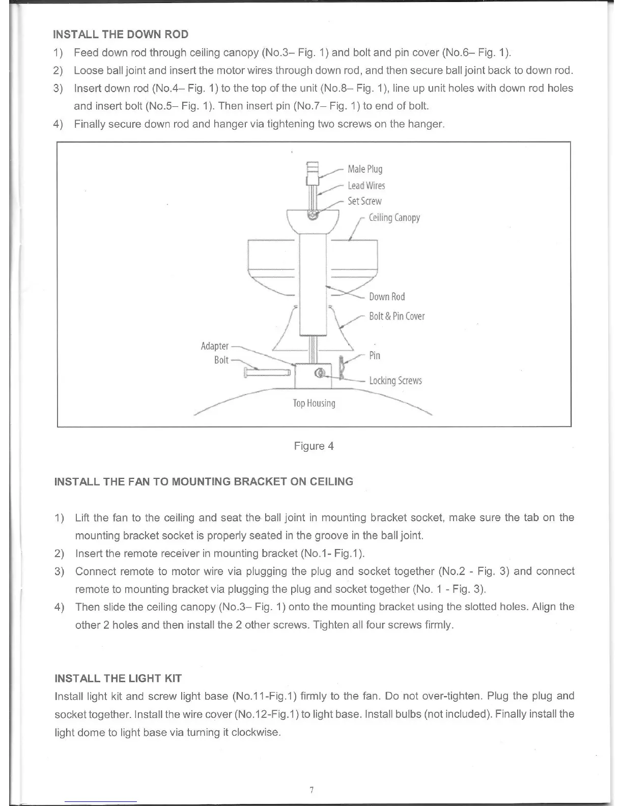 Fanaway EVO2 - Assembly Steps; Down Rod Installation; Fan to Ceiling Bracket Mounting; Light Kit Assembly
