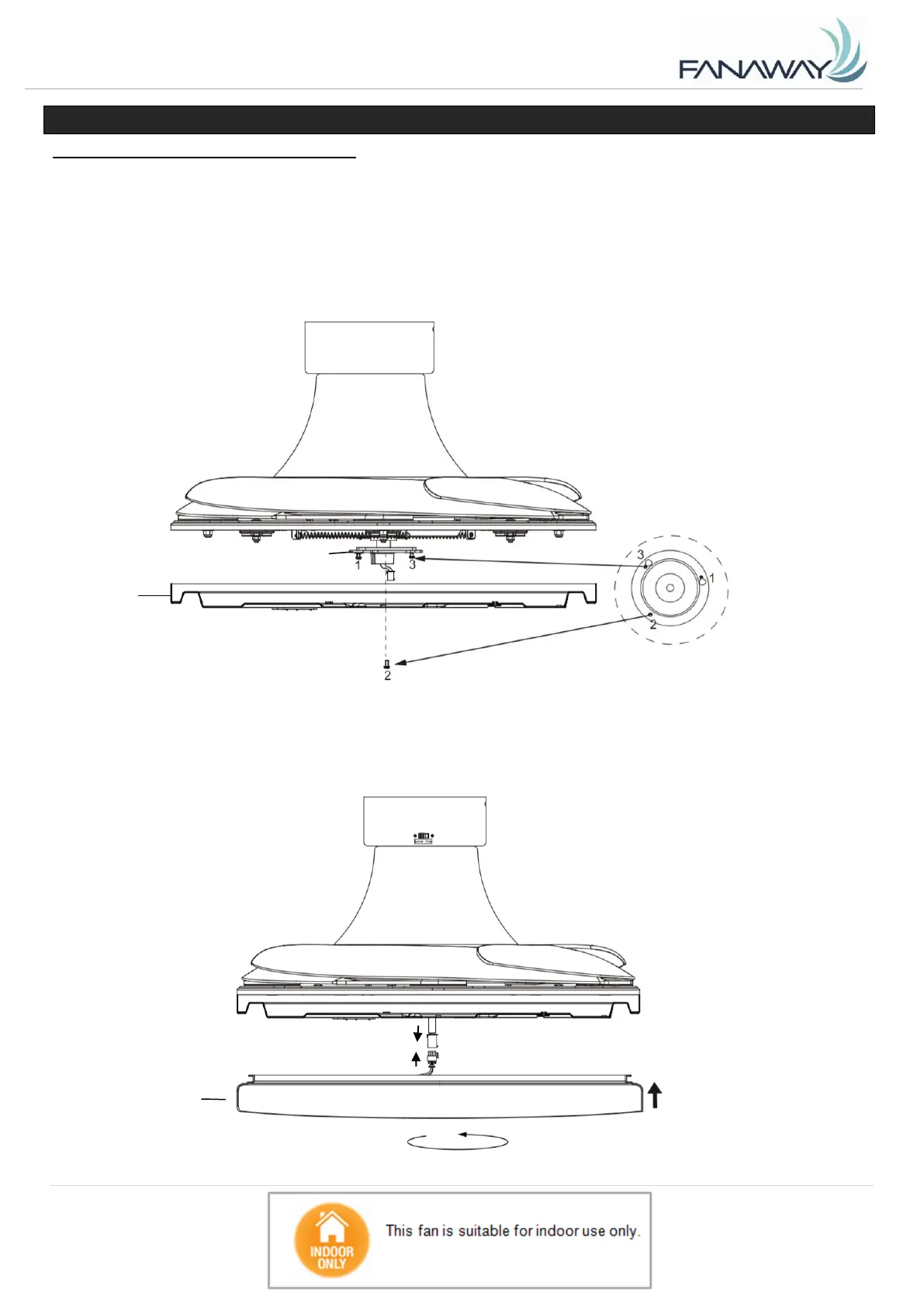 2. Turn the light kit plate counterclockwise until the slot screws(1 and 3) are firmly at the end of the slots (1