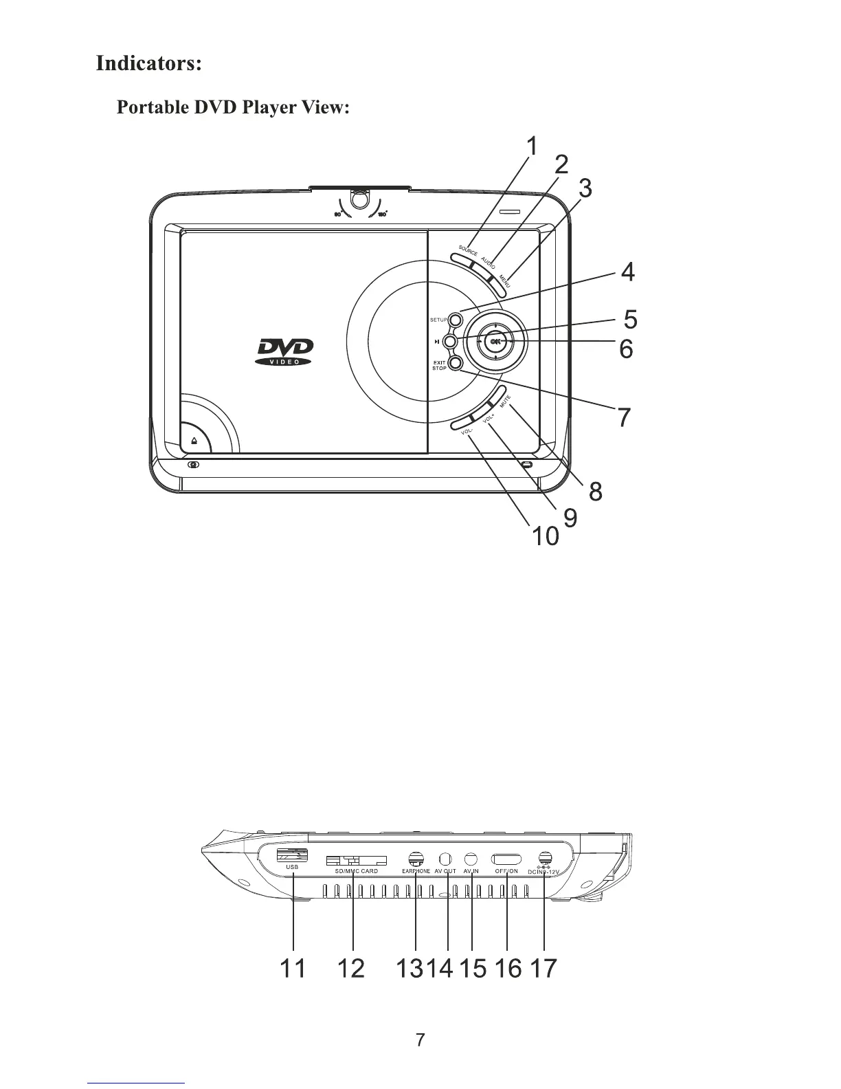 F&U DVT98607 - DVD PLAYER INDICATORS AND PORTS; PLAYER BUTTONS AND JACKS