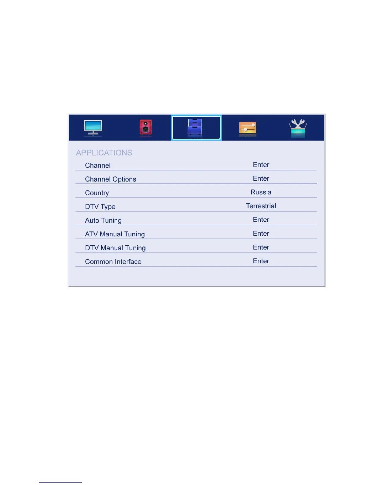 The picture is for a reference only; the actual items are the ones appearing in your TV.