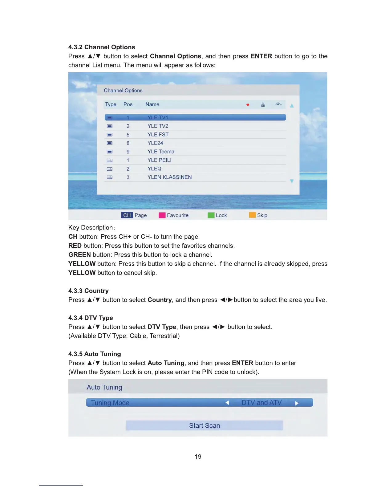 F&U FL32104 - Channel Options; Country; DTV Type; Auto Tuning