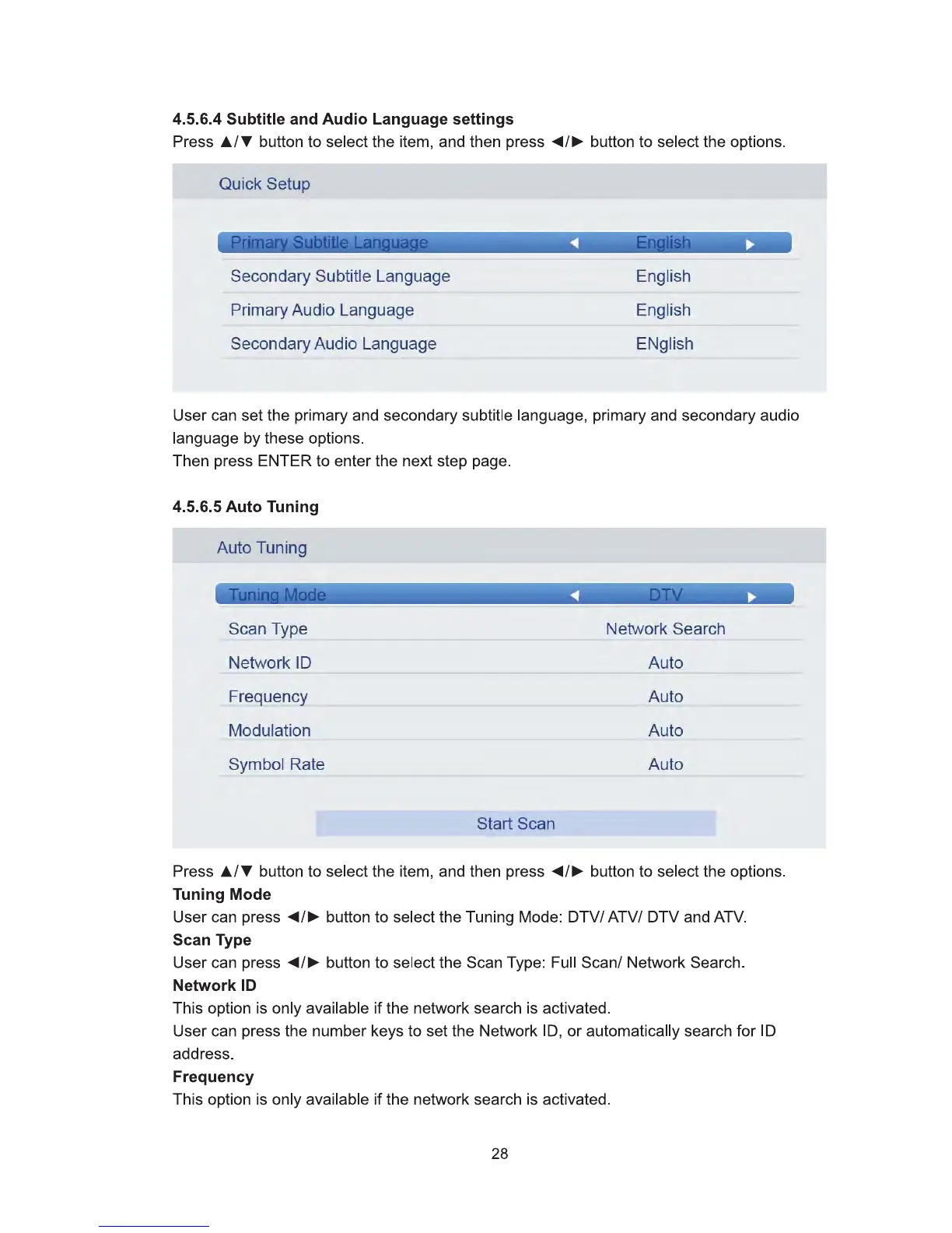 F&U FL32104 - Subtitle and Audio Language Settings; Tuning Mode; Scan Type; Network ID