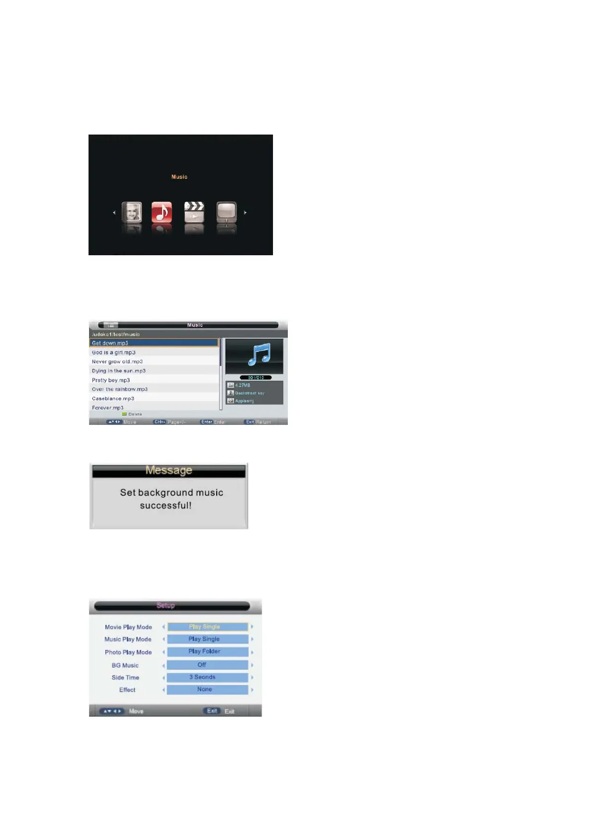 Press BLUE button it appears as follow:BG Music Folder is set.