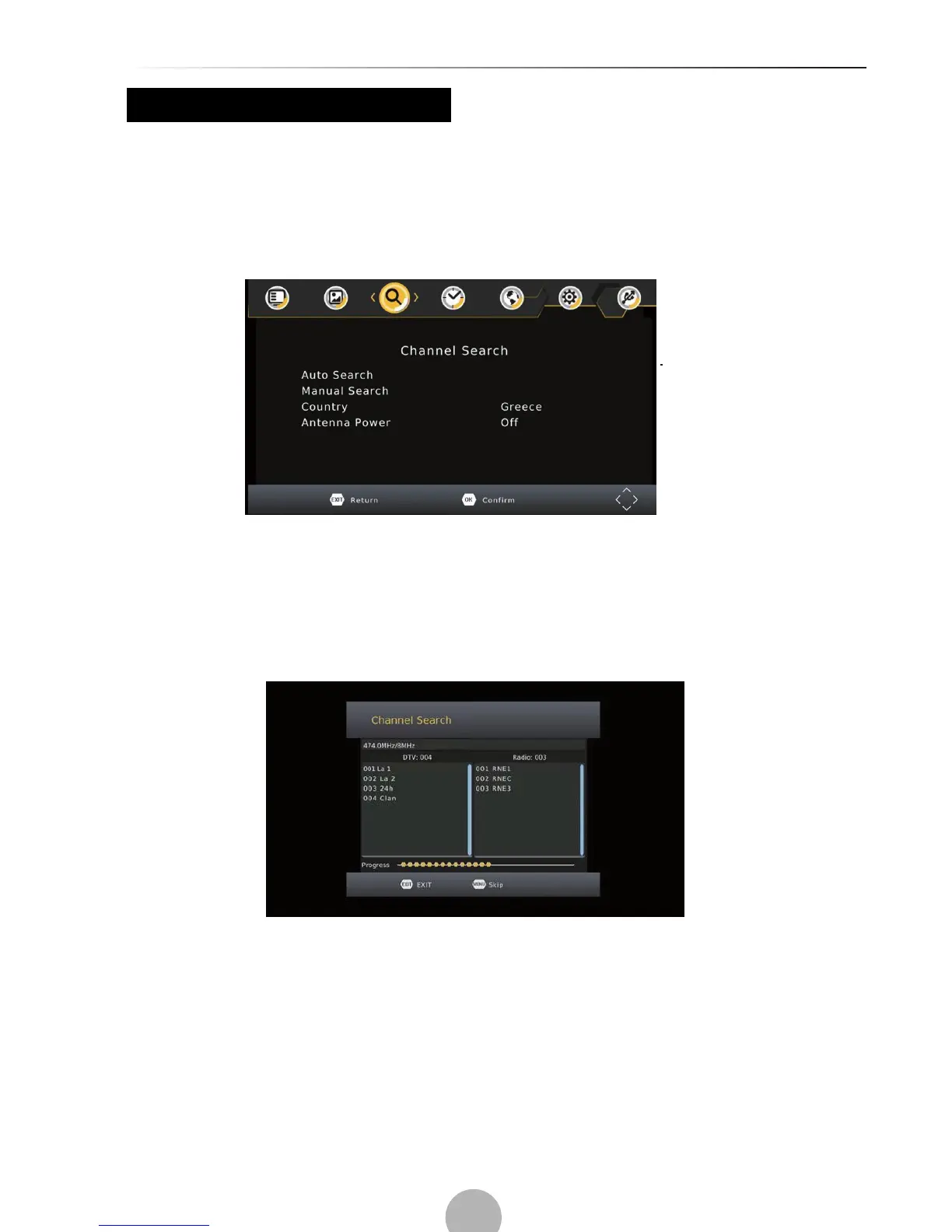1.Select [Auto Search] and press OK or RIGHT to start channel search.