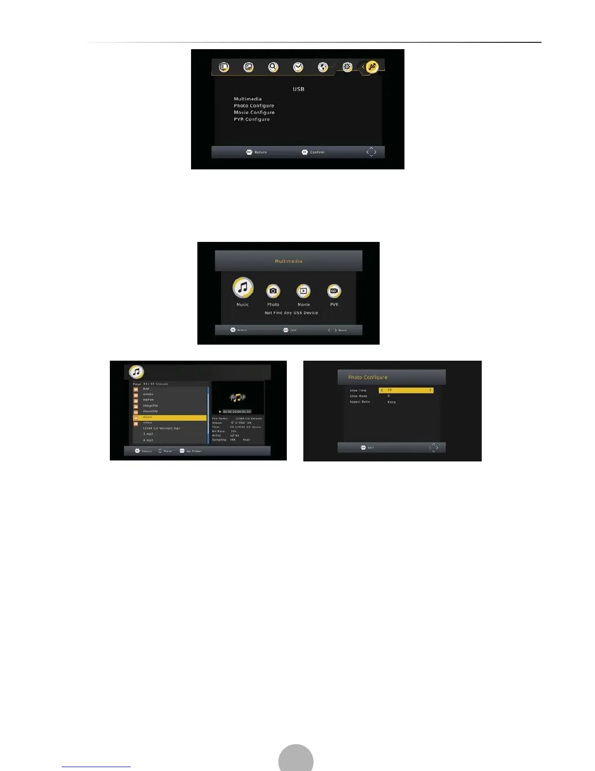 When a USB device is attached you can select from the Music, Photo, Movie or REC opitons in this