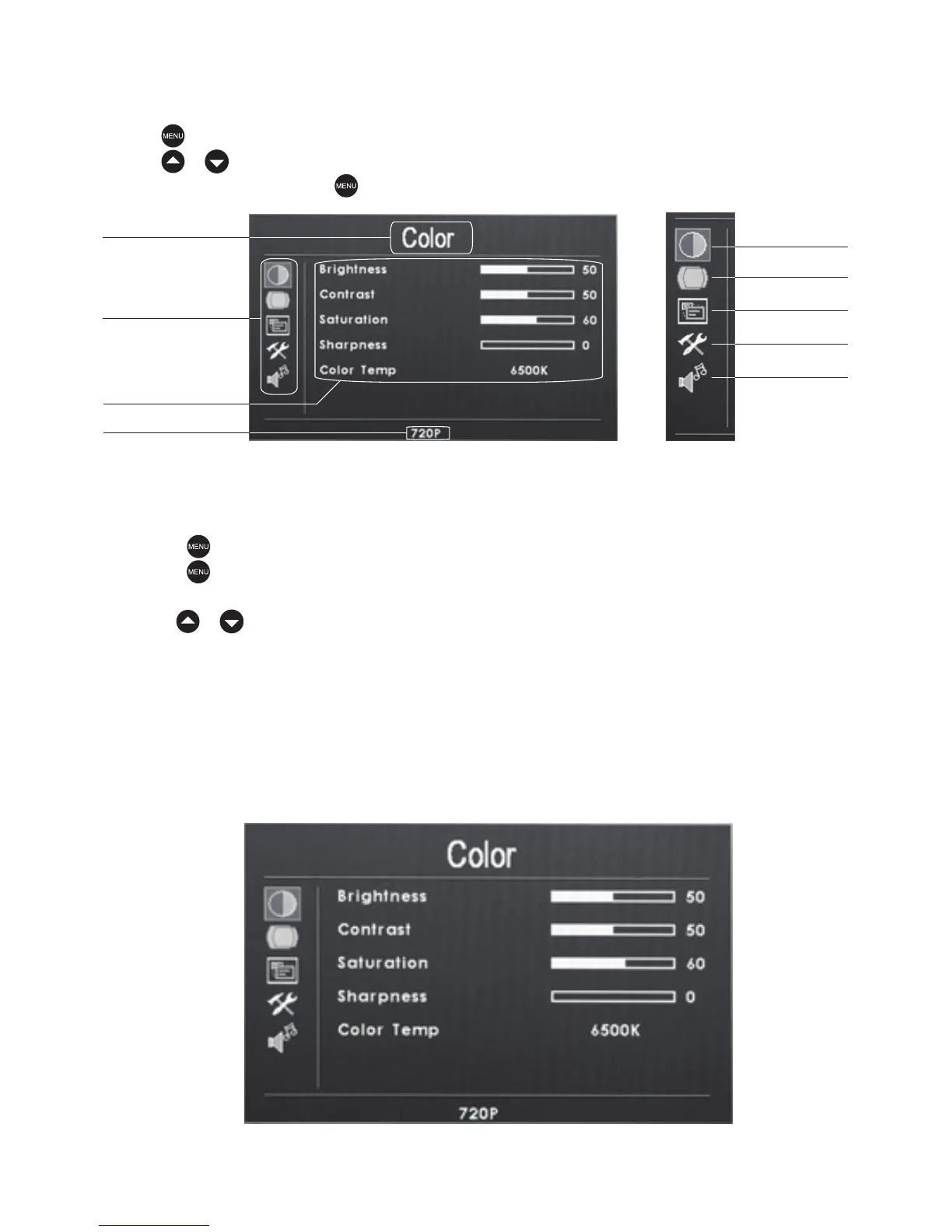 press / to select the icons,Color,Adjust,ODS,Function or Sound,and confirm