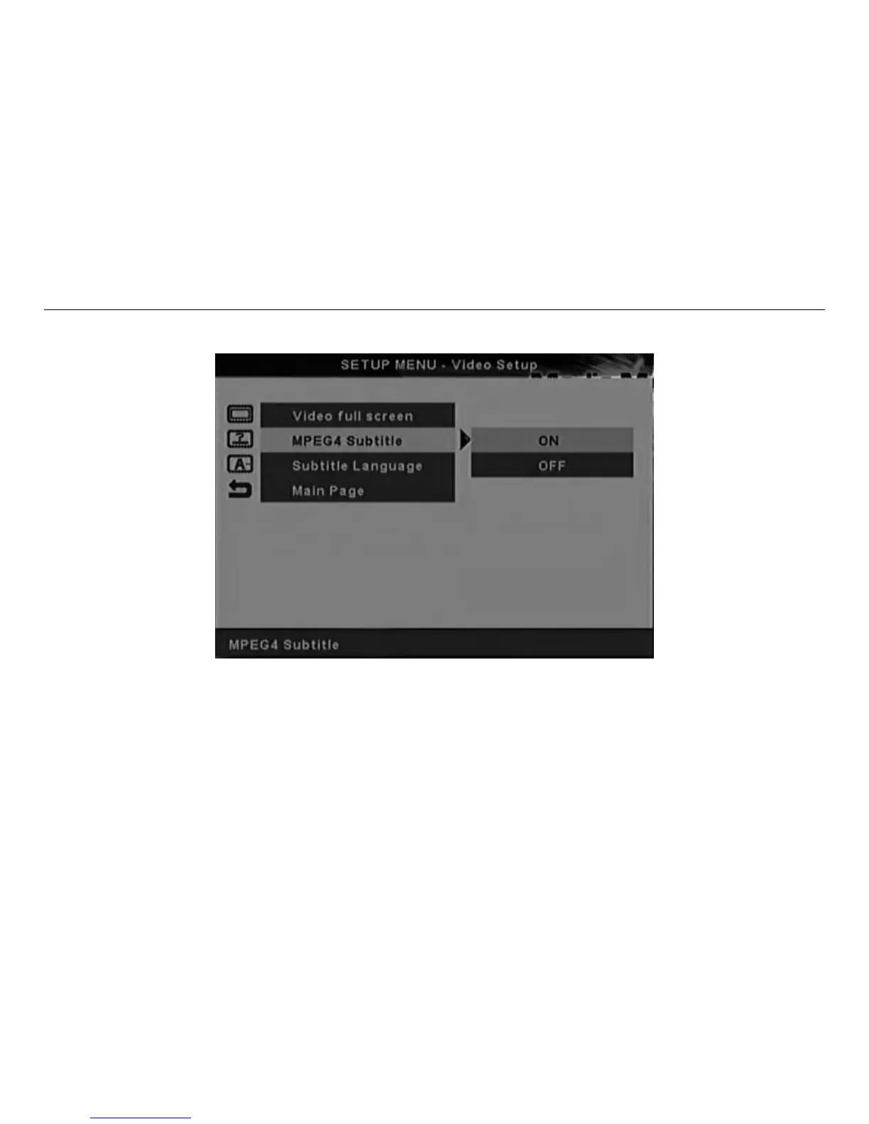 .Selecting ON will display the MPEG4 subtitle to be displayed (Factory default mode in ON).