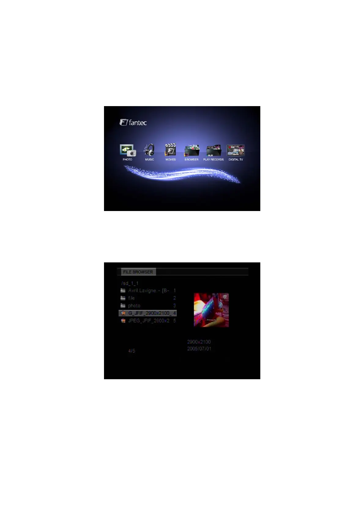 Enter the Photo menu, to display the supported image files and folders. Please go to SETUP /