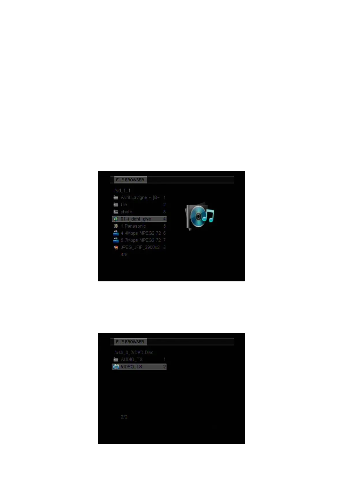 Enter the Browser menu, to display all supported video/audio/image files and folders. In this