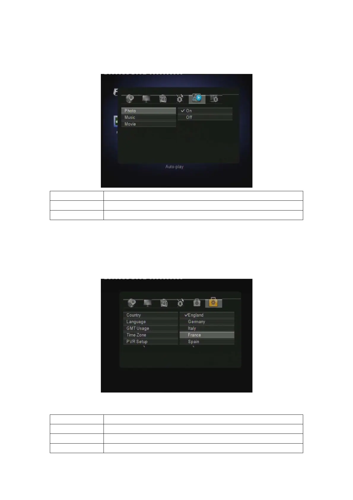 menu). In this menu, you can setup Country, Language, GMT Usage, Time Zone, PVR Device,