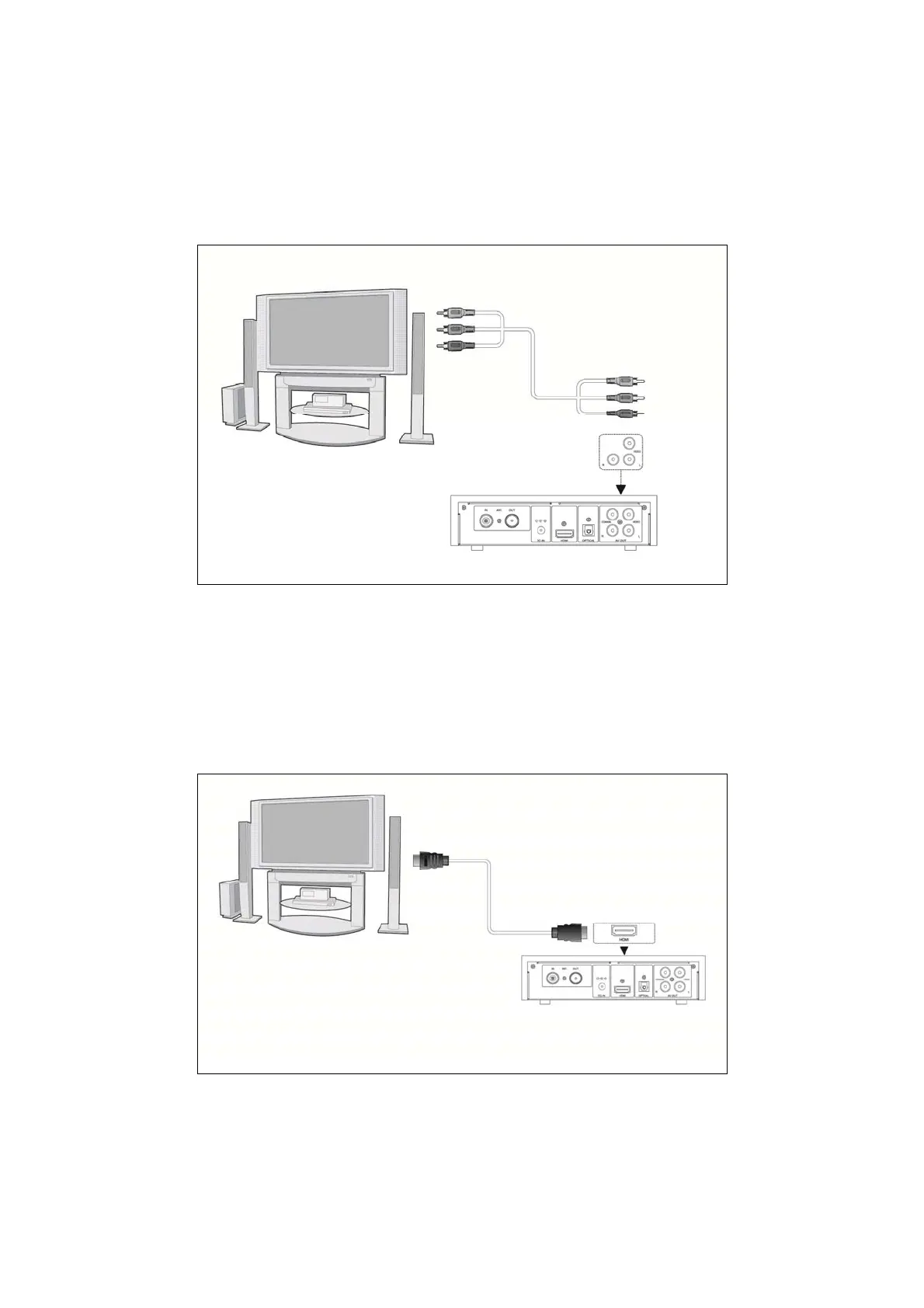 (1) Follow the picture and plug in the 3 color connector to the player’s A/V OUT jack;