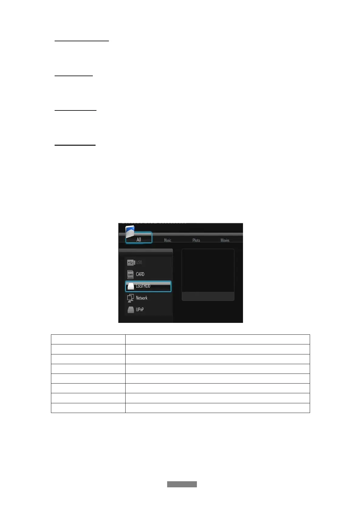 The browser menu allows you to browse and play media files stored on USB devices, Local