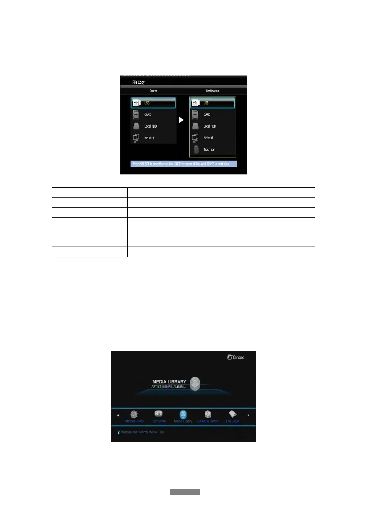 Select the File Copy icon from the home screen to enter the File Copy menu, which allows