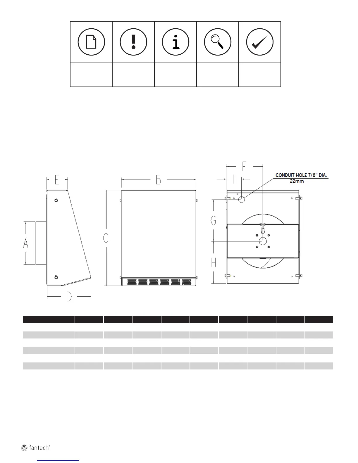 Fantech RVF 4XL - Dimensions and Specifications; RVF Model Dimensions (A-H)
