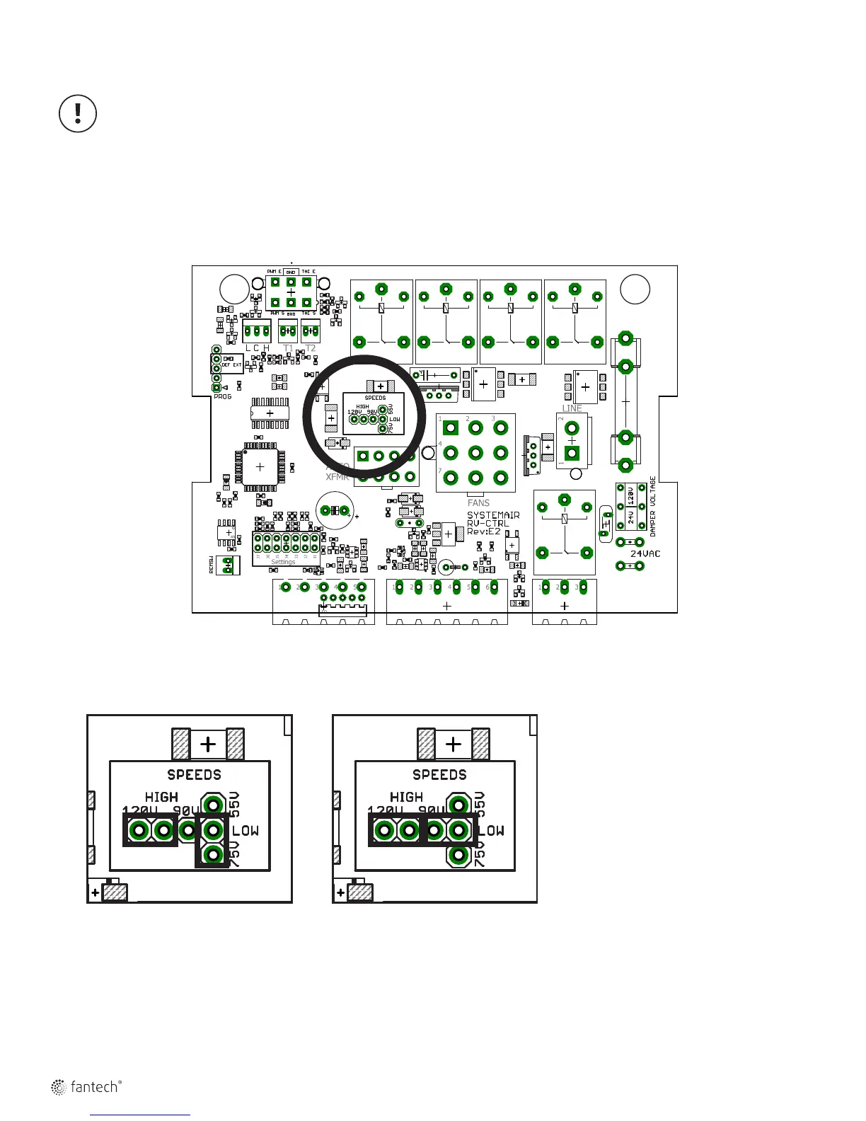 The voltage selection for low (reduced) speed of the unit is done via jumpers shown in the illustration below. The default setting 75V.