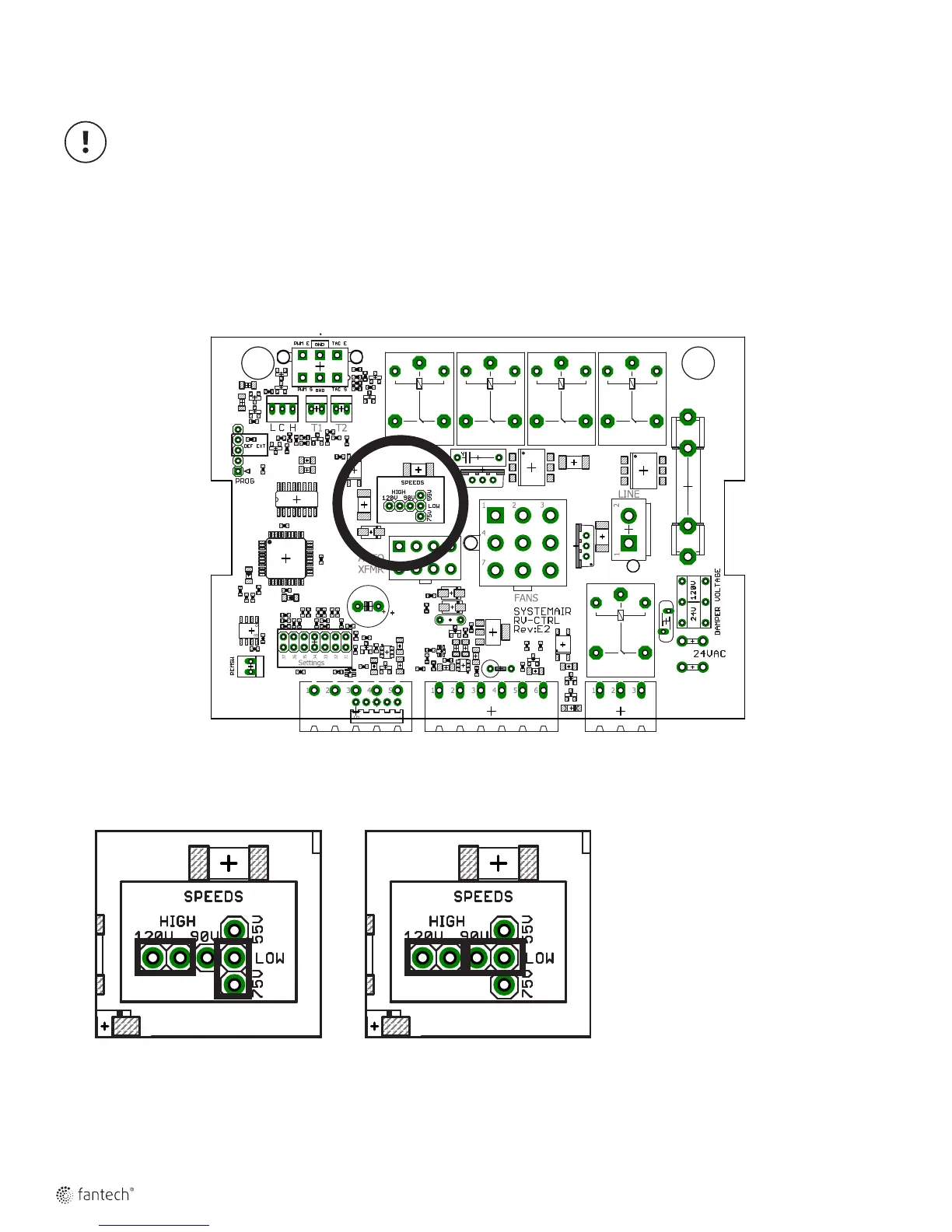 La sélection de la tension pour la basse vitesse (réduite) de l'unité se fait via les cavaliers indiqués dans l'illustration ci-dessous. Le réglage par défaut