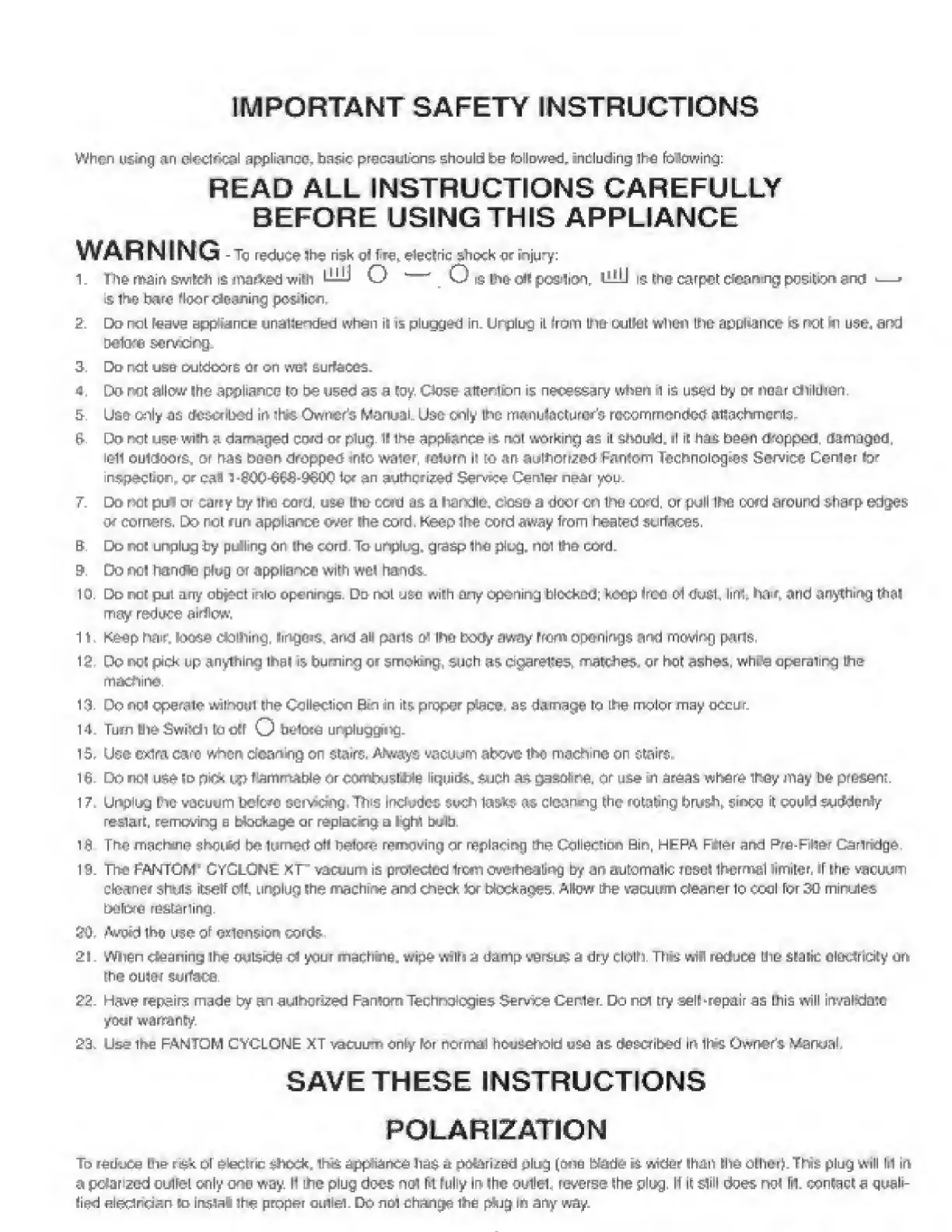 23, Use ihe FANTOM CYCLONE XT vacuum onty tor normal household um as described in irw Owner* Manual.