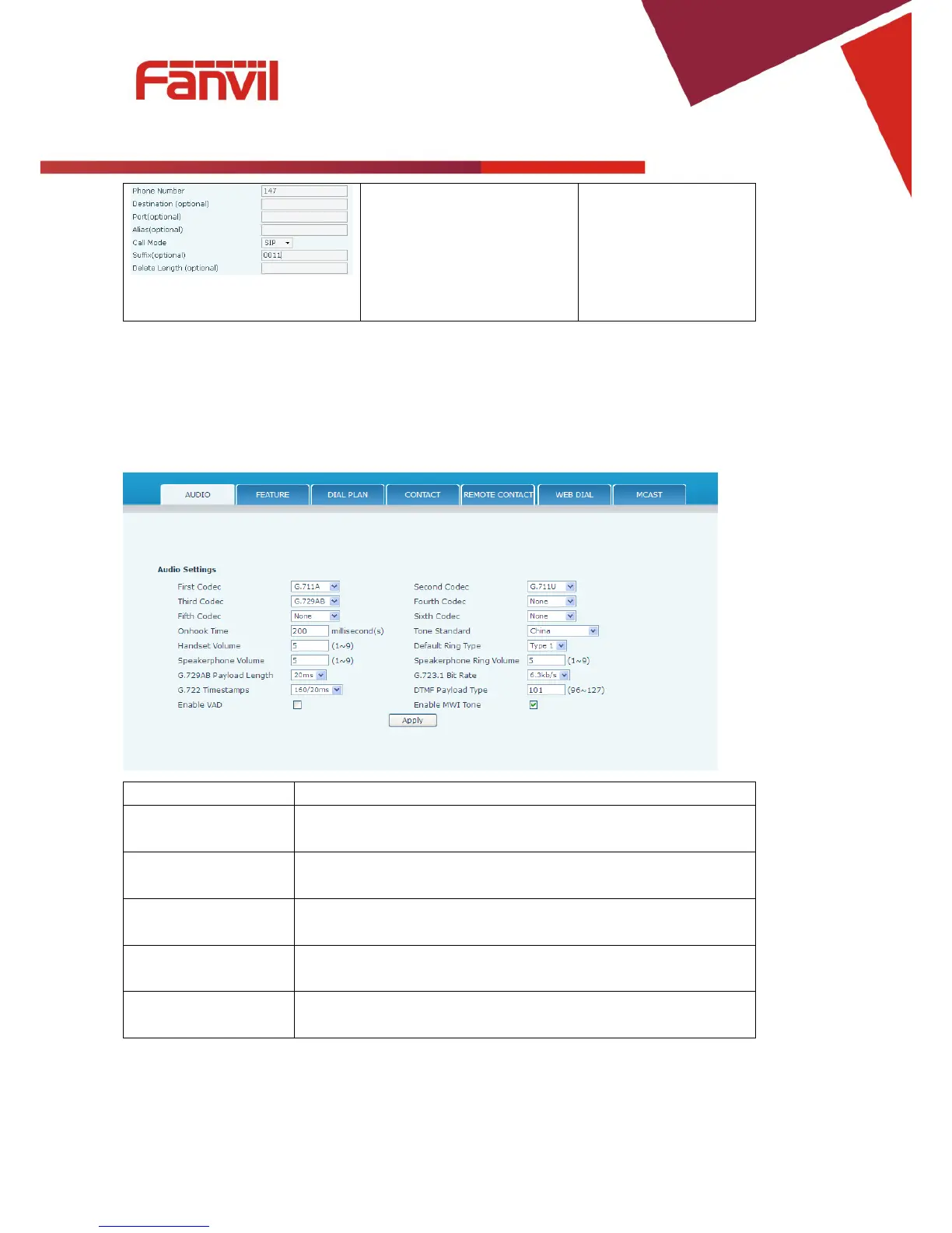 This page configures audio parameters such as voice codec, handset volume, and ringer volume.