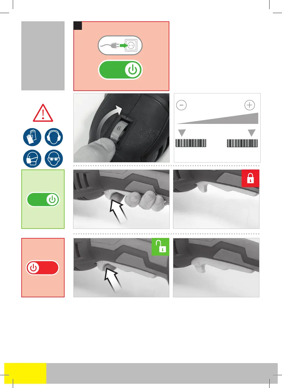 Far Tools REX 120D - Machine Operation and Controls; Powering On and Speed Adjustment; Trigger Lock Mechanism