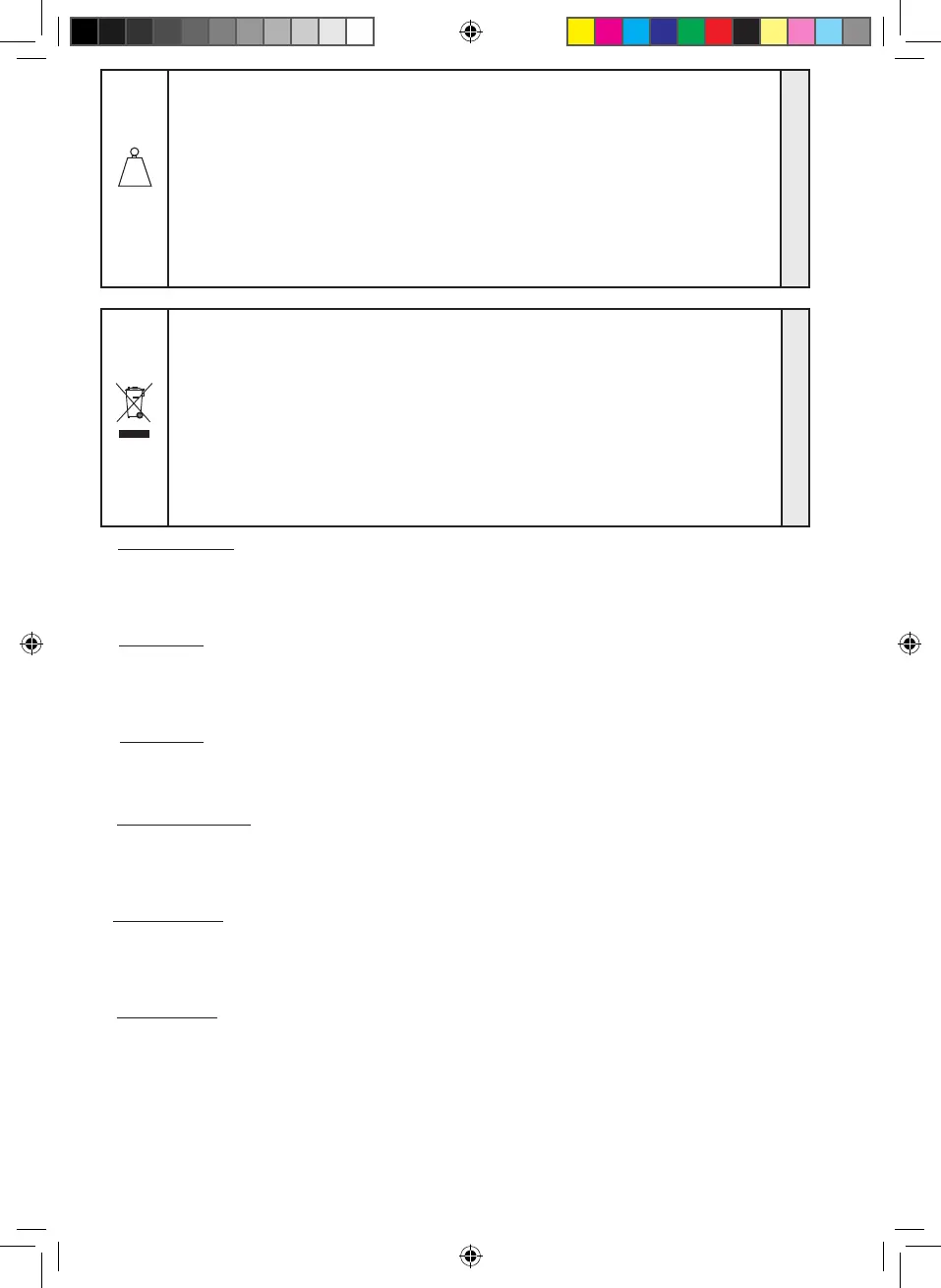 regulations in force. The appliance, batteries, oils and packaging must be deposited in the special waste elimination systems such as the