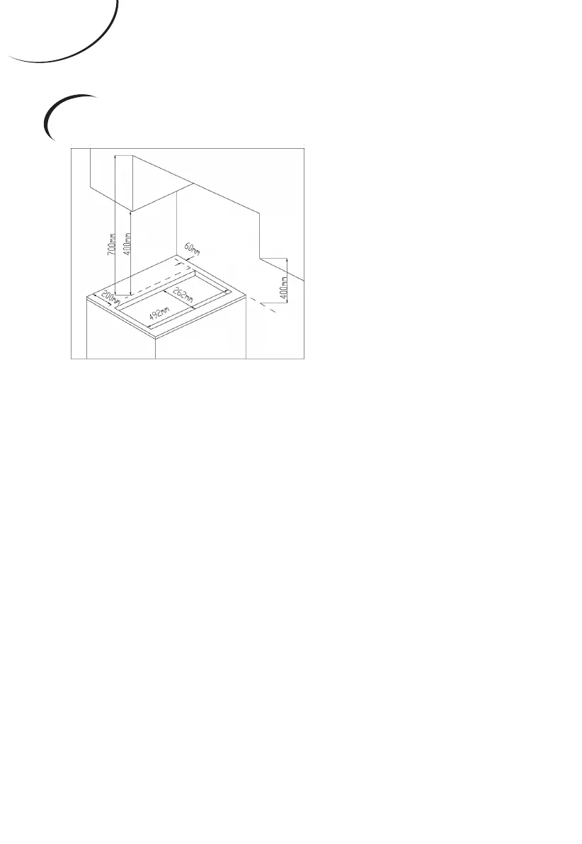 • 400 mm between the surfaces of the hob,