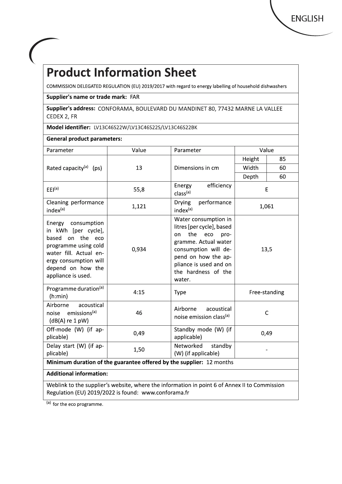 FAR LV13C46S22W - Technical Data Sheet