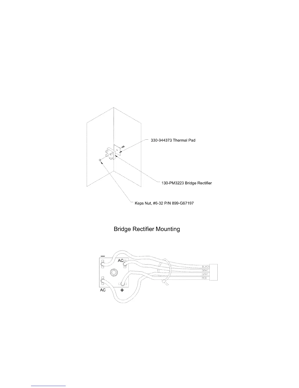 Secure the bridge rectifier (P/N 130-PM3223) to the backbox, placing the thermal pad (P/N
