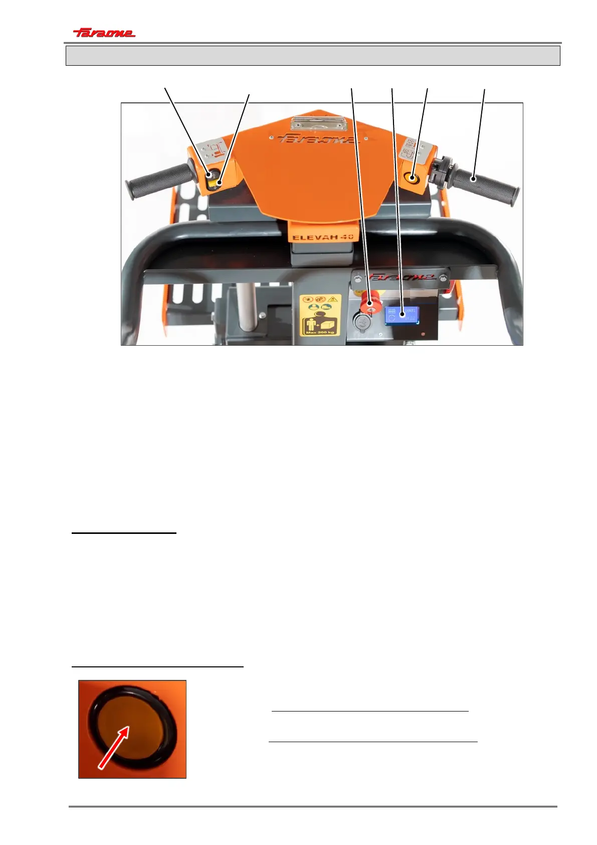• The emergency stop switch with removable key, located on the control station in the cage