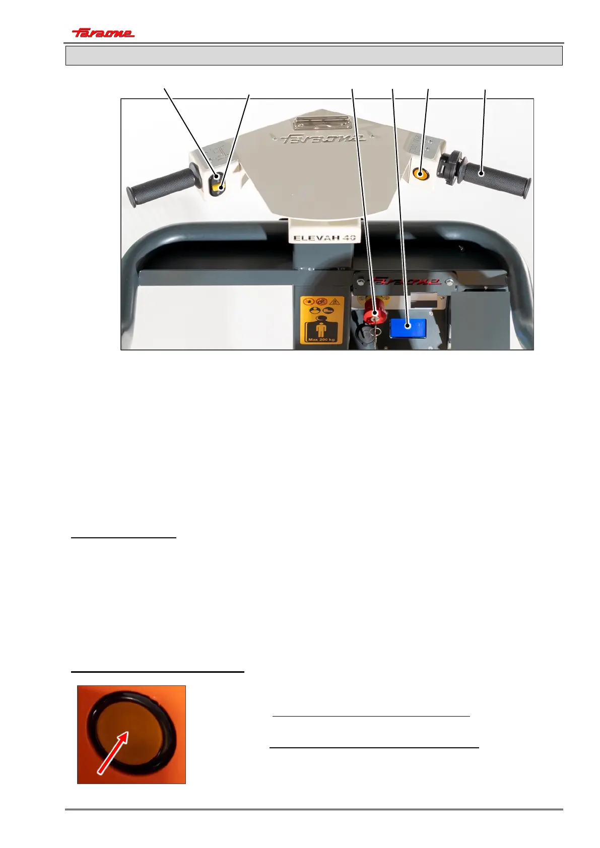 • The emergency stop switch with removable key, located on the control station in the cage