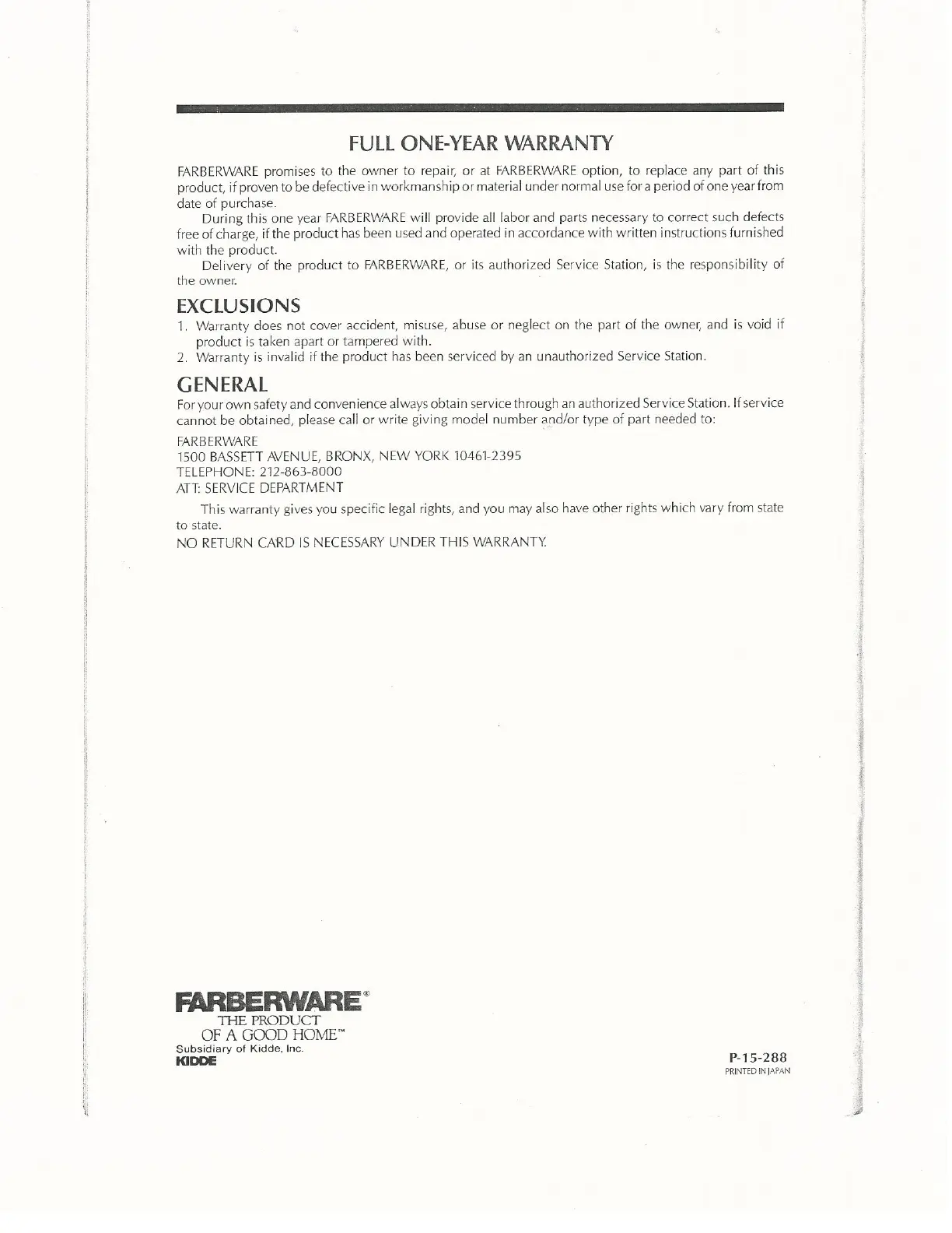 Farberware 455N - FULL ONE-YEAR WARRANTY; Exclusions and General Service Information