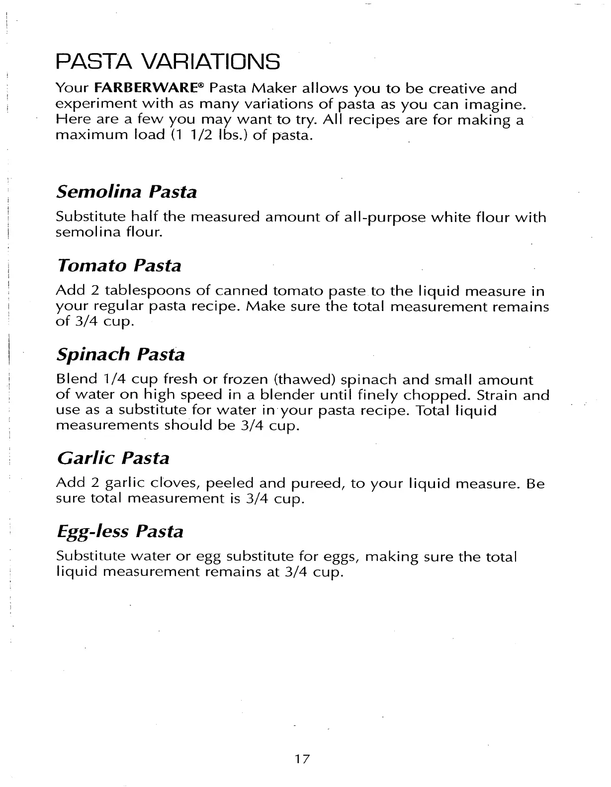 Farberware FPM100 - Pasta Variations; Semolina Pasta; Tomato Pasta; Spinach Pasta