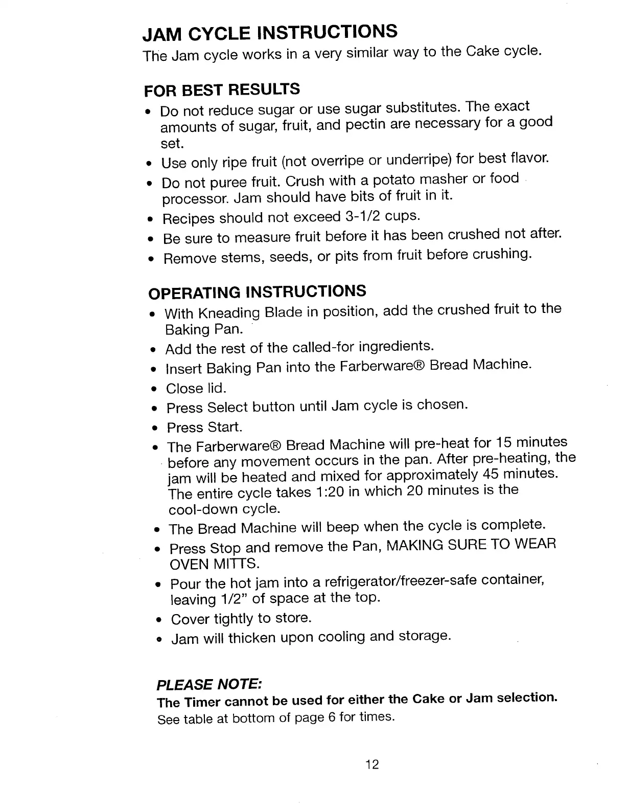 Farberware FTR700 - Jam Cycle Instructions; For Best Results: Jam