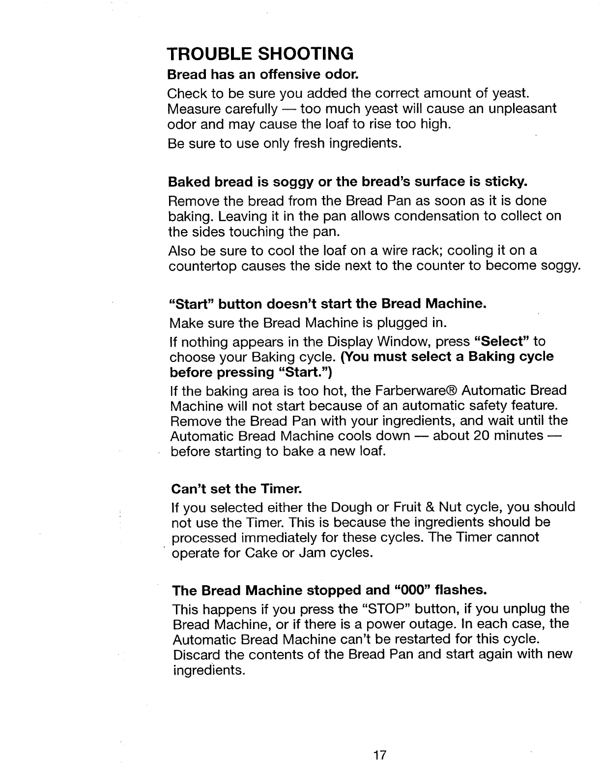 Farberware FTR700 - Trouble Shooting; Bread Has an Offensive Odor; Baked Bread is Soggy or Sticky; Start Button Fails to Start