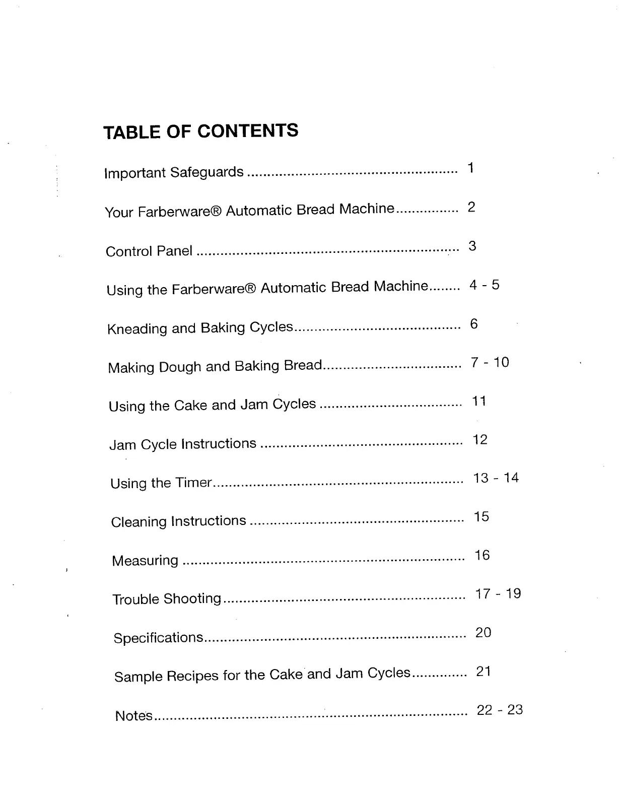 Farberware FTR700 - Table of Contents