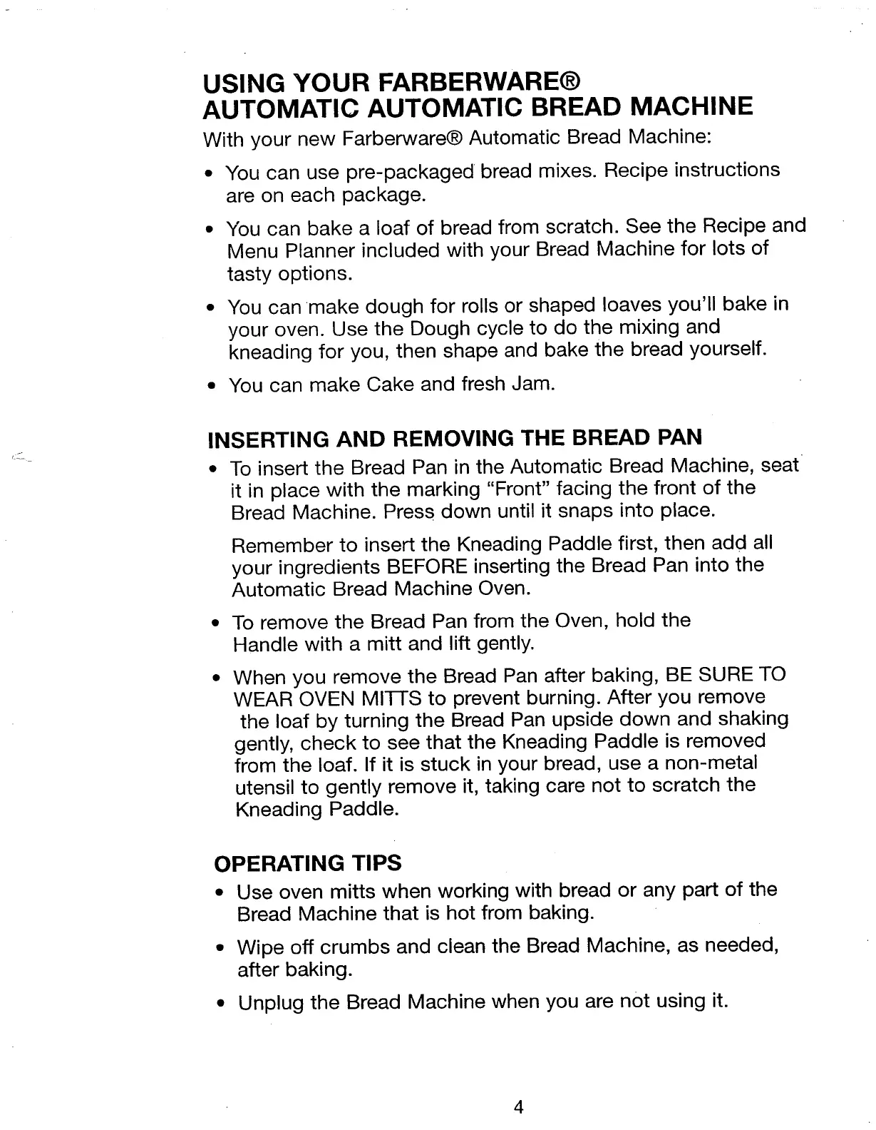Farberware FTR700 - Using Your Farberware Automatic Bread Machine; Inserting and Removing the Bread Pan; Operating Tips