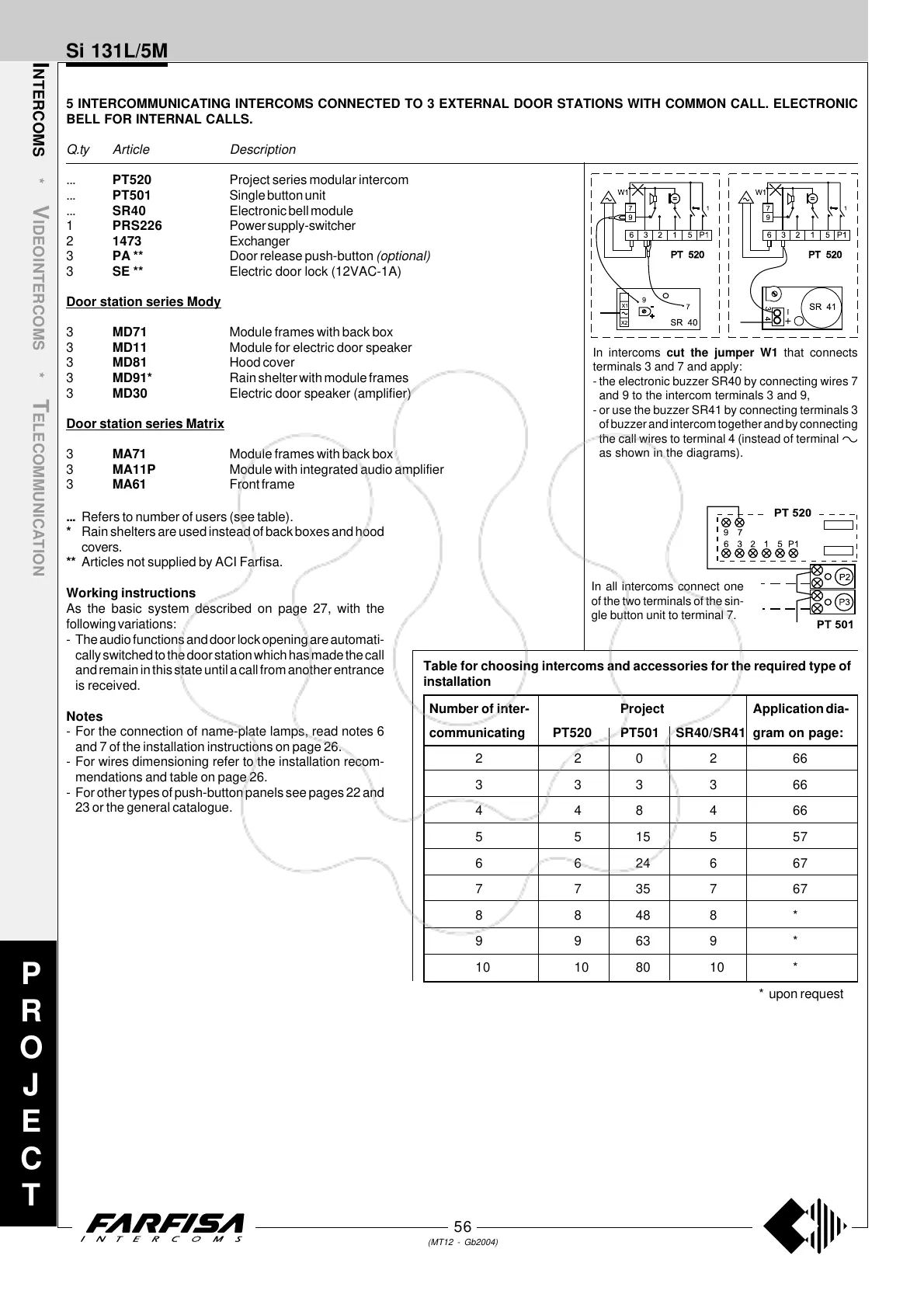 Table for choosing intercoms and accessories for the required type of